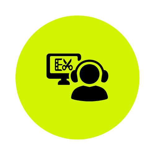 Icon of a person with headphones in front of a computer monitor displaying a webpage with scissors and lines, indicating editing or editing support.