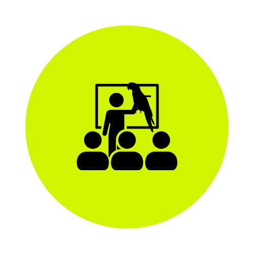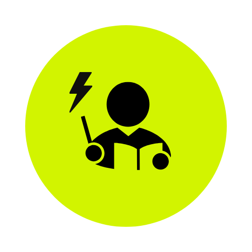 Icon of a person reading a book with a lightning bolt next to their head, inside a yellow-green circle.