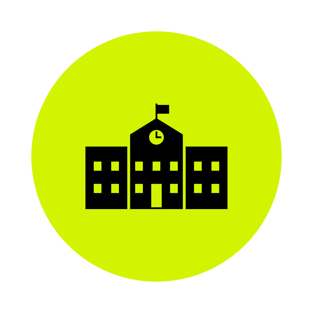 Icon of a school building with a clock and flag inside a yellow circle on a black background.