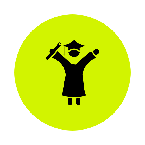 Icon of a graduate wearing a cap and gown, holding a diploma, inside a green circle.